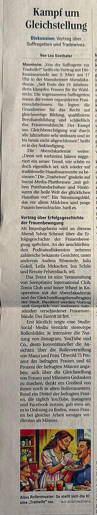 Soroptimist International Club Mannheim, Zonta Club und Inner Wheel veranstalten in Kooperation mit der Abendakademie und der Gleichstellungsbeauftragten eine Podiumsdiskussion “Von der Suffragette zum Tradwife”.